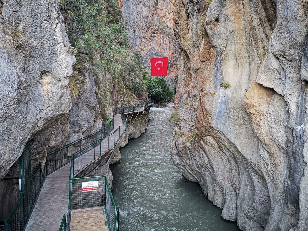 Do národného parku Saklikent to máme iba kúsok. Miesnym lákadlom je úchvatný skalný kaňon – toho času zatvorený. Miestny predavač vstupného ešte sladko spí na terase reštaurácie. Iba sa prevalí na druhý bok a poprosí nás, aby sme mu dali ešte dve hodinky. Kaňon fotíme spoza zamknutej bránky a poberáme sa dalej. Ešte by tu mal byť nejaký vodopád, tak ho skúsime pohľadať.