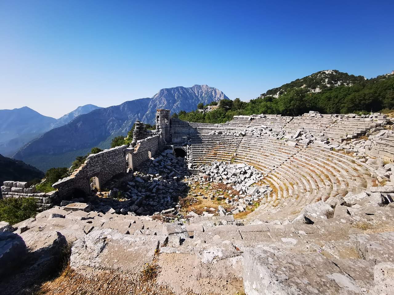 Ráno o deviatej sedíme na kopci a užívame si výhľad. Na jeho úpätí sa rozkladajú zrúcaniny antického mesta. No, zrúcaniny. Tritisícročný amfiteáter vyzerá lepšie ako letné kino v Starom Smokovci.