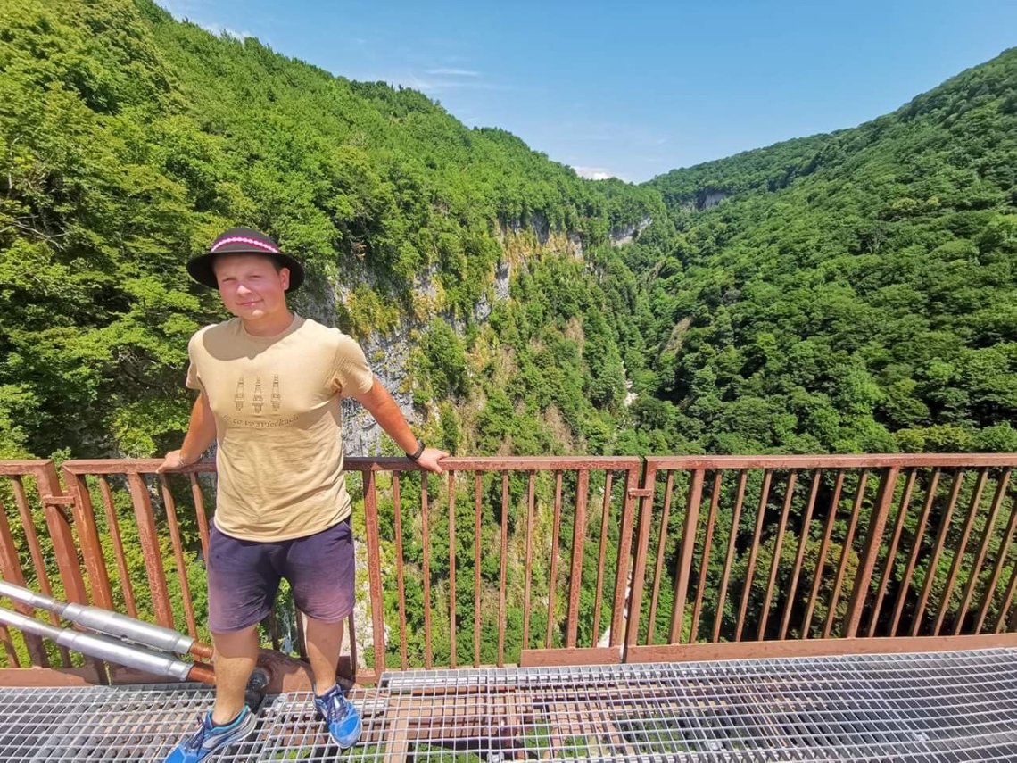 S tými priepasťami ale nekončíme. Miestnym turistickým lákadlom je visutý chodník kaňonom Okatse. Chodníček ku kaňonu taxikári popisujú ako strašnú túru a ponúkajú odvoz. Nie nie, prejdeme sa.